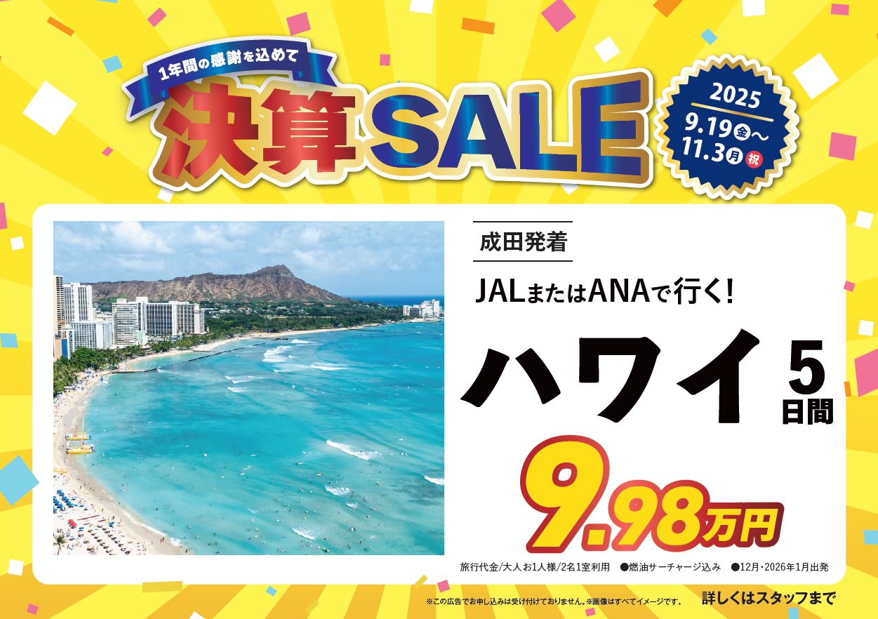 TEL(その他) | ■1階 海外旅行専門店:050-1751-4891 国内旅行専門店:050-1751-5971 ◆3階 目的別専門店 ※3階HISテーマ別専門店は電話番号が異なります。 詳細は各ホームページからご確認くださいませ。 □Across No.1:050-1741-9006 □スポーツイベント:050-1741-9498 □語学研修デスク:050-1753-1721 □エコツアーデスク:050-1751-5130 □スタディツアーデスク:050-1751-5159 □世界一周旅行専門デスク:050-1745-7061 □海外航空券スペシャリストデスク:050-1745-1604 □ネイチャーワールド・秘境旅行専門(世界遺産)デスク:050-1743-1938 □ユニバーサルツーリズムデスク:050-1745-7057 □クオリタ:050-1746-3879 □音楽鑑賞デスク:050-1746-3882 |