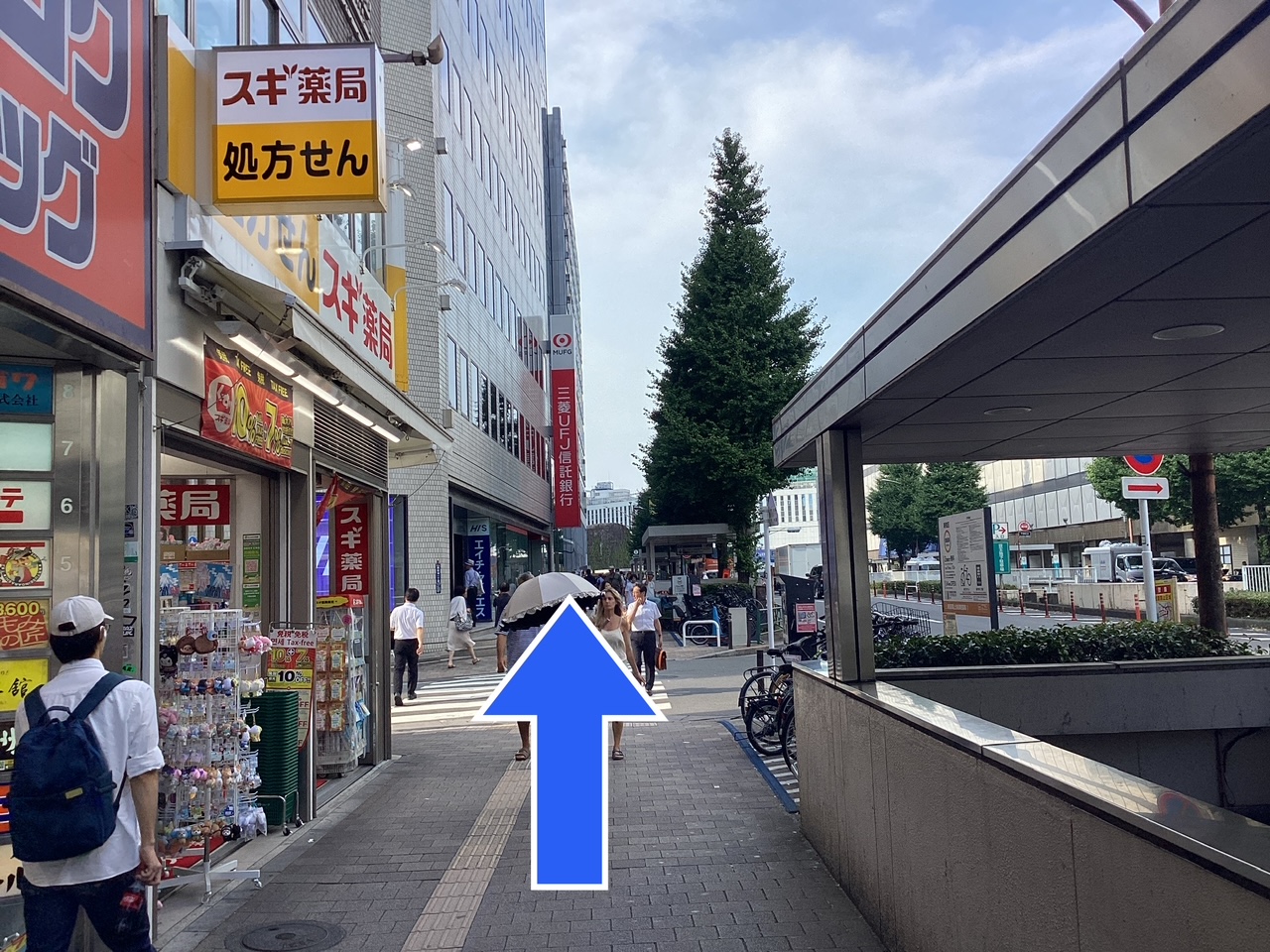 ⑤横断歩道を渡ると左側にHISの看板が見えます(左写真)