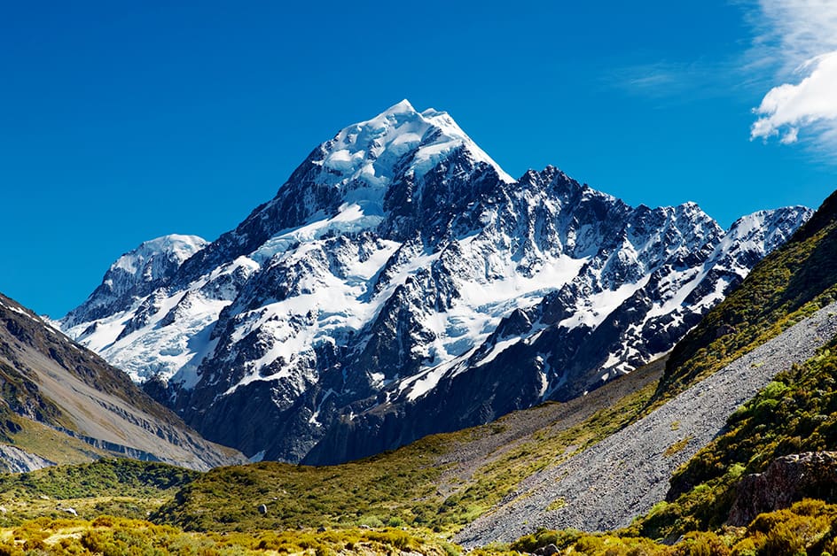 雄大にそびえる岩肌と白く輝く残雪が絶妙なコントラストを生み出しす世界遺産マウントクック。