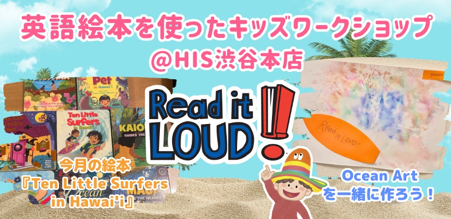 11月は「Ten Little Surfers in Hawai’i」という絵本を 英語と日本語で読み聞かせ。 ハワイの作家によるハワイメイドの英語絵本です! その後アクティビティ「Ocean Art」を作成します。 カラーペンとお水を使って、いつもと少し違ったペイント方法をご紹介 自分だけのカラフルな作品を作りましょう! 絵本とクラフトづくりを通して親子で英語のコミュニケーションをしてみませんか? 英語が初めてのお子様でも、楽しくご参加いただけるワークショップです。 会場:HIS渋谷本店(渋谷モディB1F) 日時: 11月15日(土) 第1部:11:15-11:55 第2部:12:15-12:55 の2部制です。 お好きな枠でご参加いただけます。 所要時間:40分