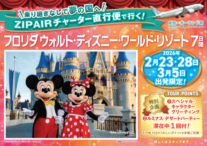 【ZIPAIRチャーター直行便で行く!フロリダ ウォルト・ディズニー・ワールド・リゾート7日間】発売開始! 2025/10/30