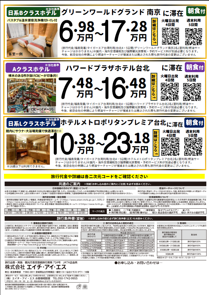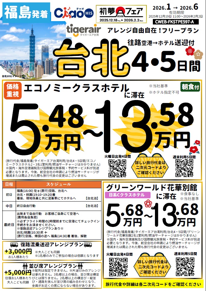 タイガーエアー利用福島発着台湾行きツアー商品(Ciaoのみ対象)