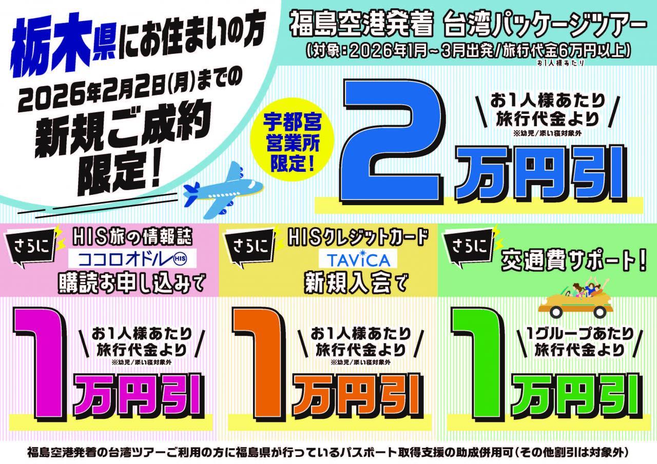 2026年1月~2026年3月までのご出発にお申込み頂いた栃木・茨城県にお住まいのお客様 ※大人・子供同額(幼児/添寝対象外)《対象商品》
