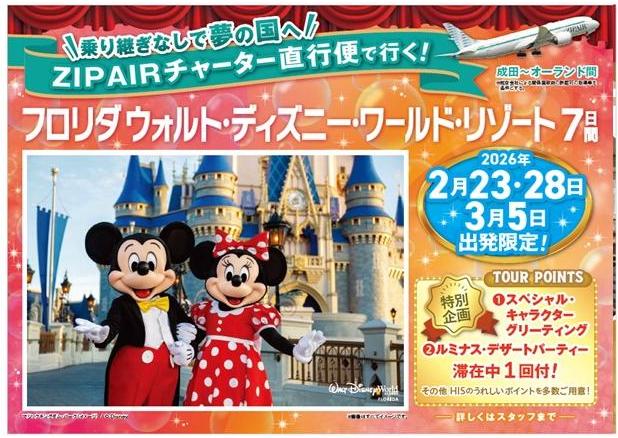 ★★★【ZIPAIRチャーター直行便で行く!フロリダ ウォルト・ディズニー・ワールド・リゾート7日間】発売開始!★★★ 2025/10/30