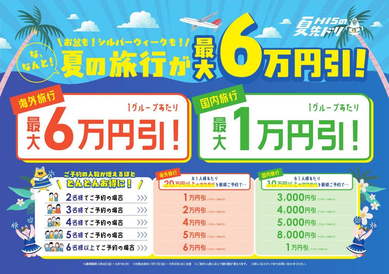 ※HIS店舗での国内旅行のお取り扱いについては、「航空券+ホテルのパッケージプランのみ」となります。国内航空券のみ、鉄道、国内ホテル、国内バスツアーのお取扱いはございませんので、ご予約の際は弊社オンライン予約サイトまたは新宿国内旅行専門店へお問合せお願いいたします。