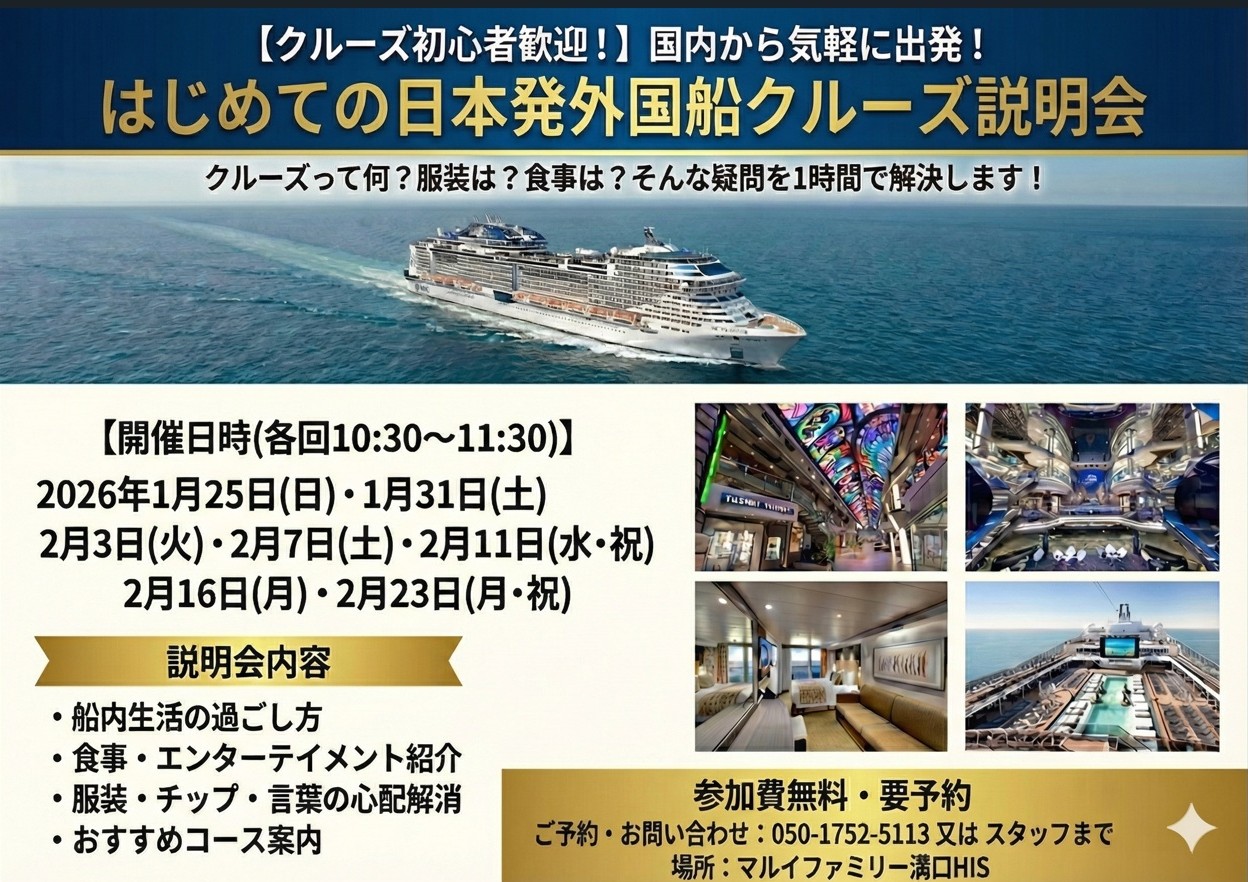 寝ている間に次の目的地へ到着する、移動そのものがエンターテインメントになるクルーズの旅。本説明会では、日本発着の外国客船紹介から、気になるお食事・アクティビティ、お得な予約方法まで、専門スタッフがわかりやすく解説いたします。