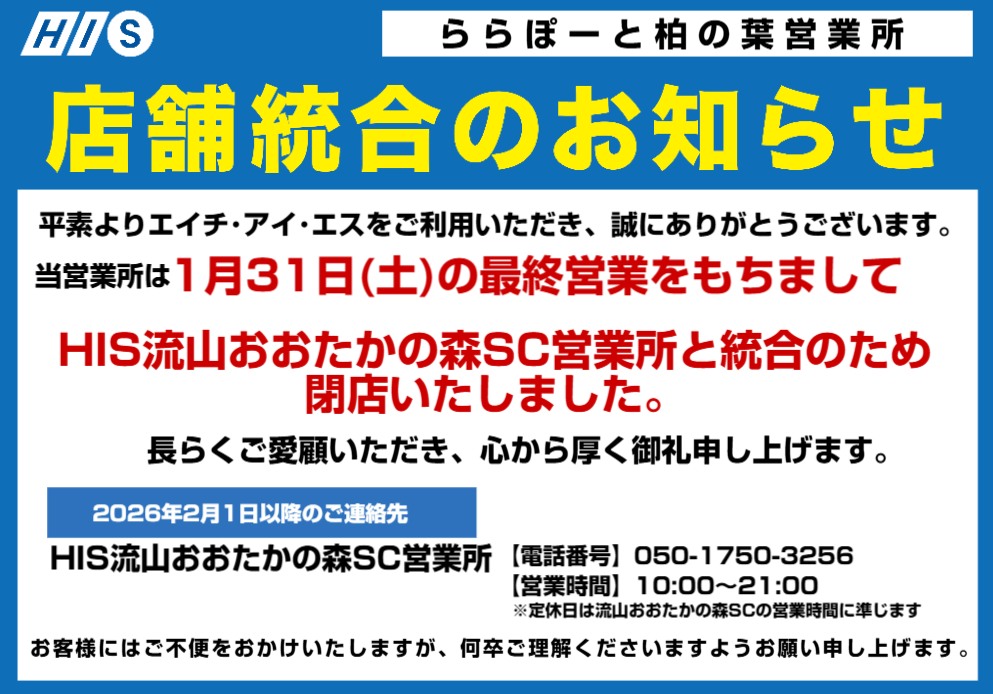 HISららぽーと柏の葉営業所統廃合のお知らせ 2026/01/05