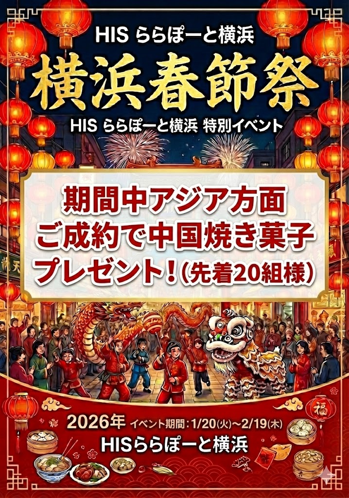 HISららぽーと横浜でも、この春節の賑わいに合わせてアジア方面ご検討のお客様に特典をご用意しました!