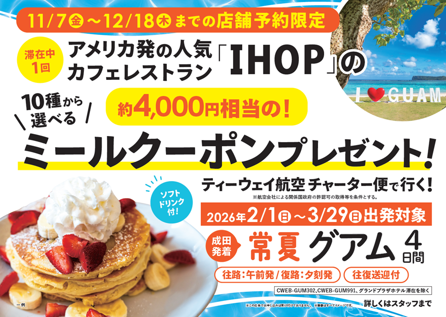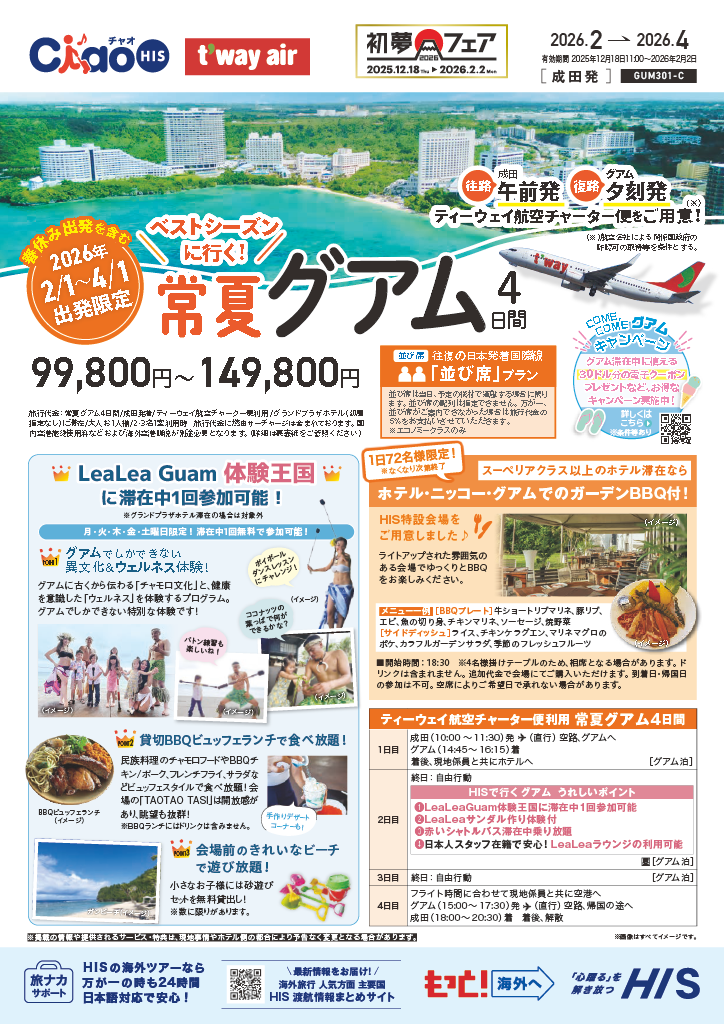 春休み出発を含む人気期間にチャーター便でグアムへ!