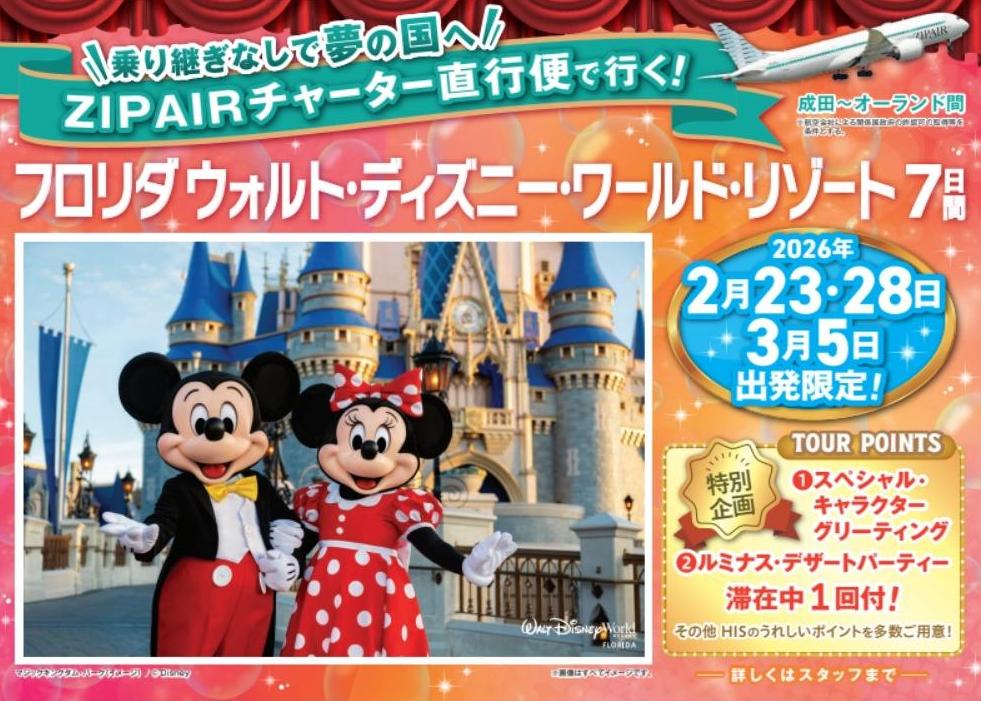 ★★★【ZIPAIRチャーター直行便で行く!フロリダ ウォルト・ディズニー・ワールド・リゾート7日間】発売開始!★★★ 2025/11/04