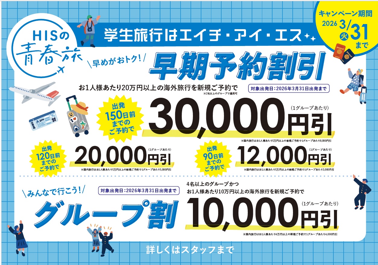 2026年3月31日ご出発までの学生旅行をお申込みいただいた皆様に