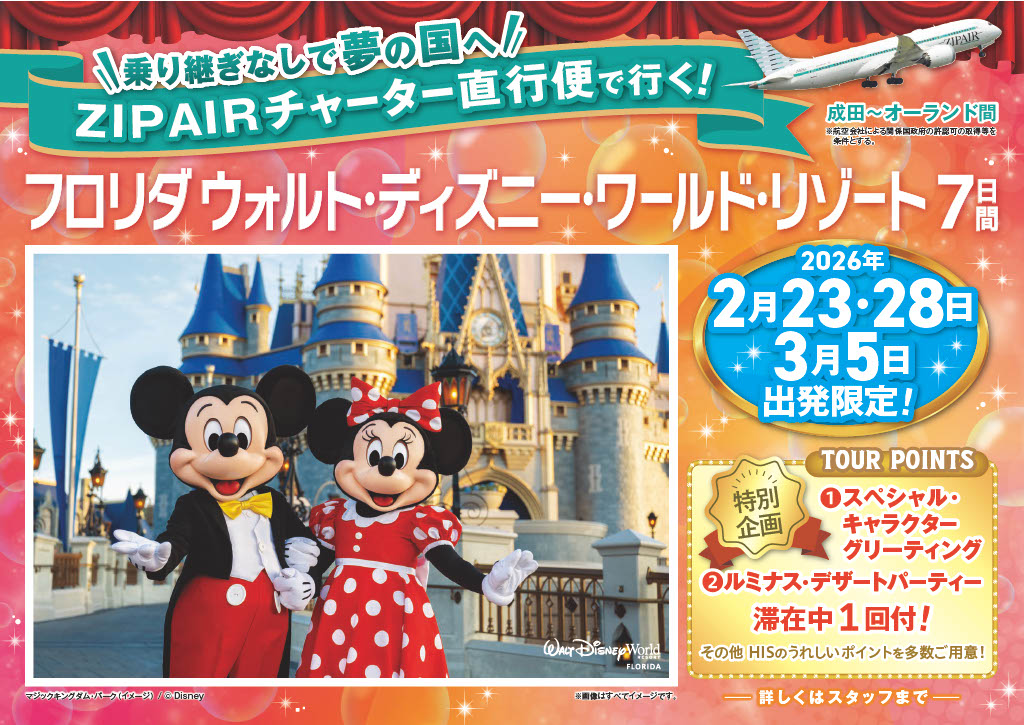 【ZIPAIRチャーター直行便で行く!フロリダ ウォルト・ディズニー・ワールド・リゾート7日間】を販売開始しました!
