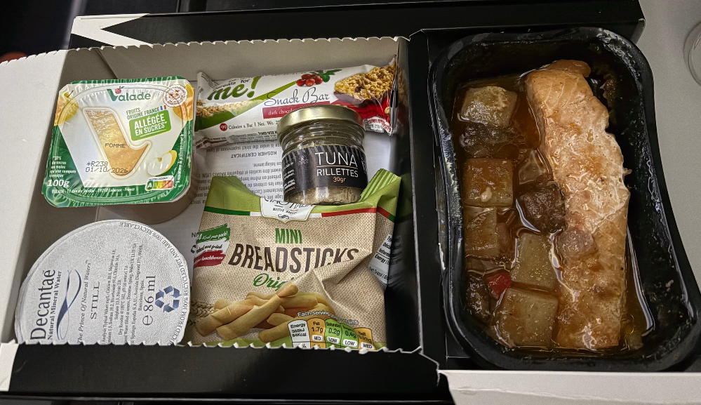 復路では、特別食を利用しました。私はユダヤ教ではないですが、調査としてユダヤ教機内食をいただきました。