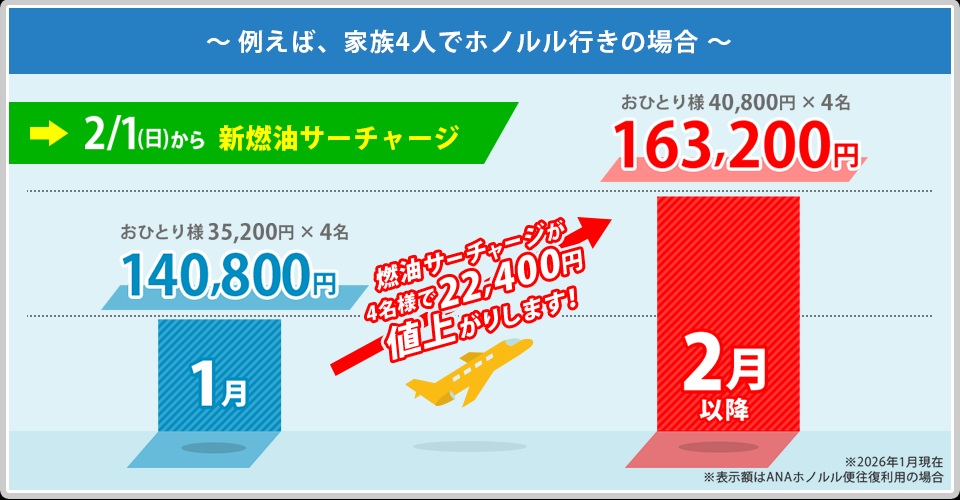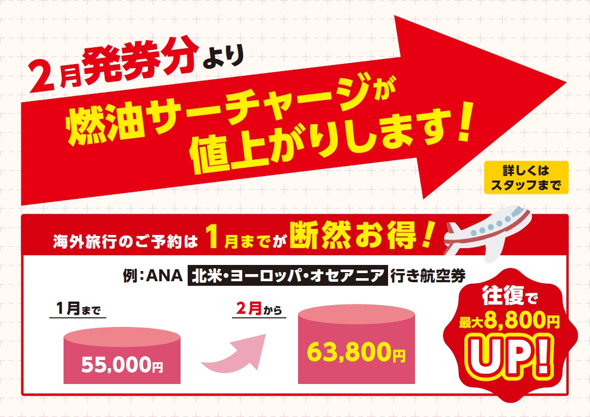 2月から燃油が上がります!海外旅行の予約は1月中がお得!