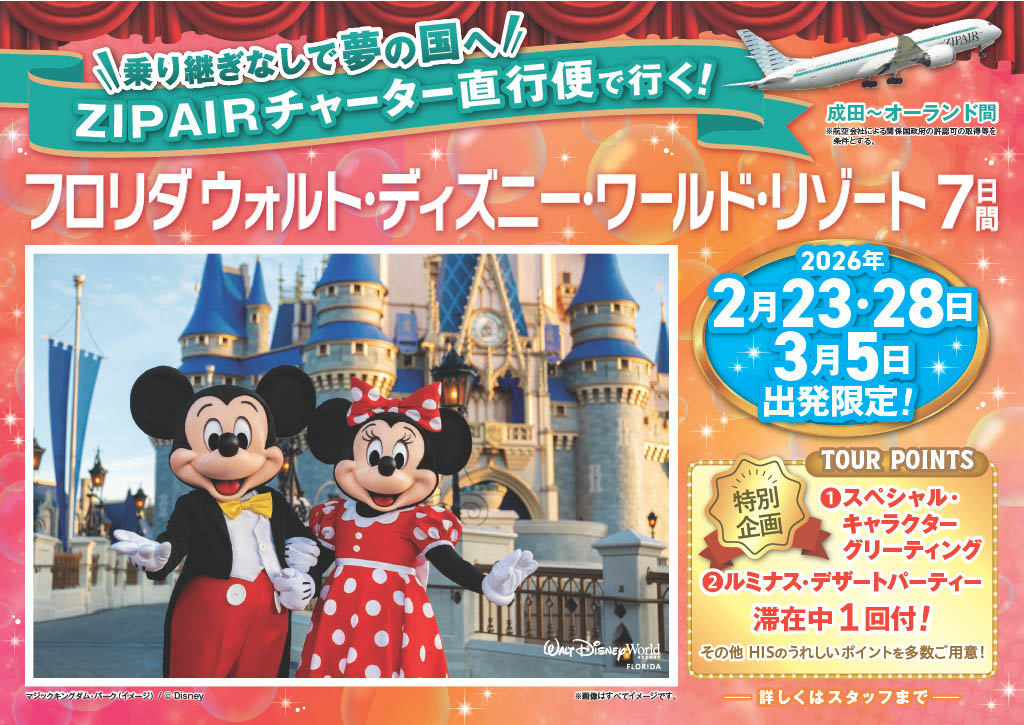【ZIPAIRチャーター直行便で行く!フロリダ ウォルト・ディズニー・ワールド・リゾート7日間】を販売開始しました!