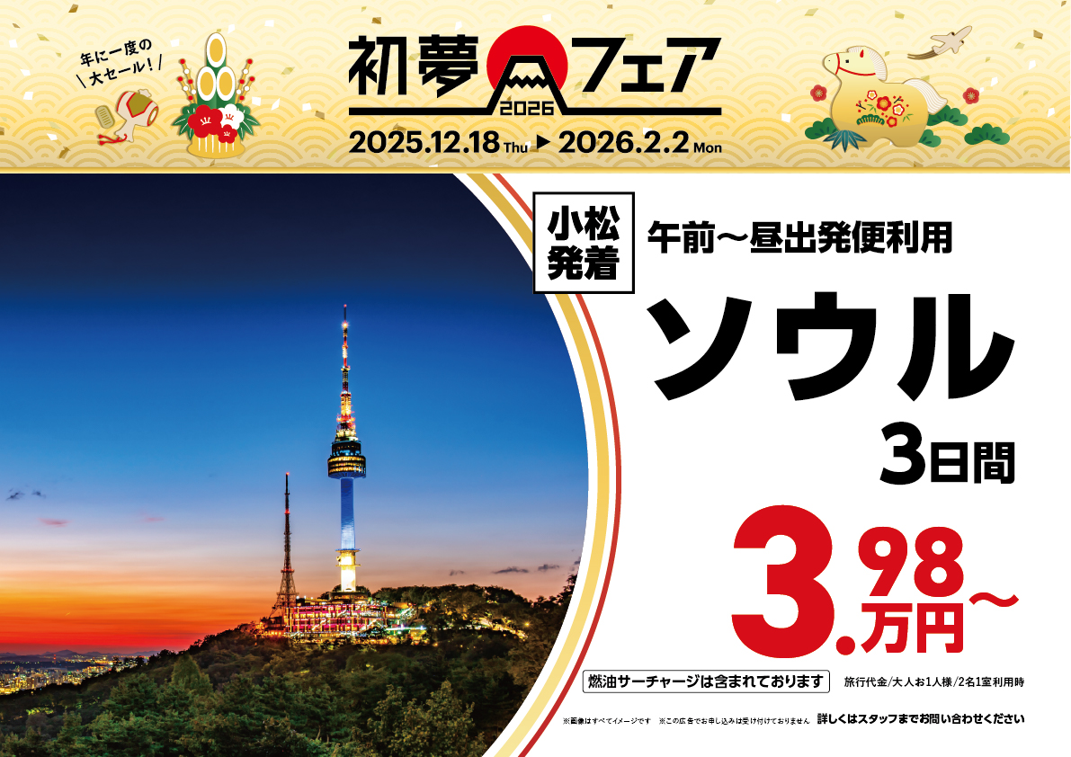小松発ソウルツアー(3日間)が39,800円~