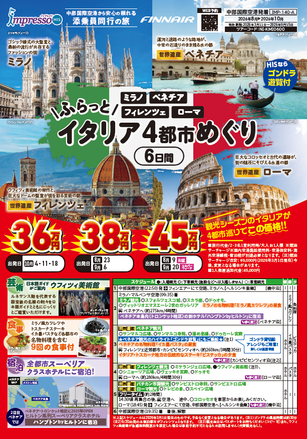 『ふらっとイタリア4都市めぐり6日間』