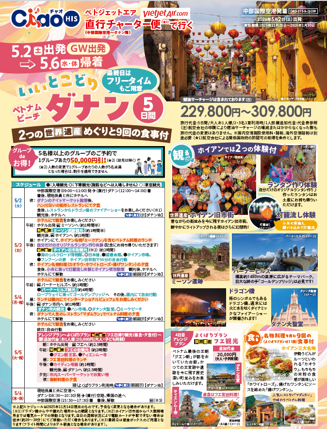名物料理含む9回の食事付 直行チャーター便で行く いいとこどりダナン5日間