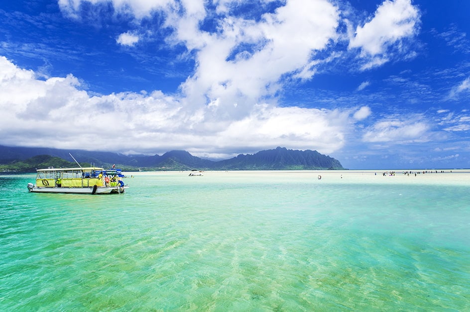 カネオヘ湾の沖に広がるサンドバーは、全米最長最大級の珊瑚礁を誇る大自然の宝石!大人気の絶景