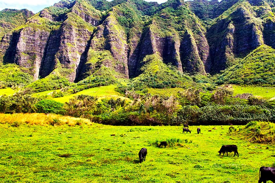 オアフ島屈指の大自然スポットで映画ロケ地ツアー90分(映画ロケ地ツアー、牧場&農園ツアー)とオーシャンボヤージツアー90分をお楽しみください。