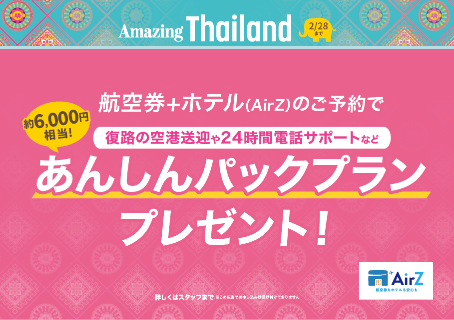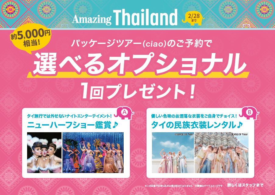 期間中のバンコク行きのCiao・AirZ予約でオプショナルプレゼント!
