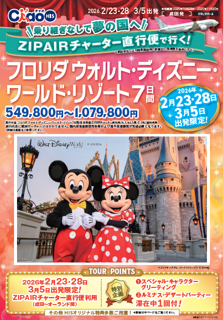 【ZIPAIRチャーター直行便で行く!フロリダ ウォルト・ディズニー・ワールド・リゾート7日間】を販売開始しました!