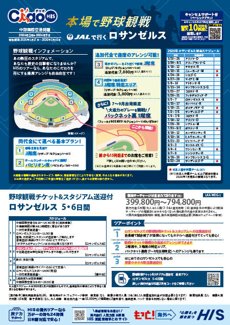 ◆野球観戦チケット&スタジアム送迎付 JALで行くロサンゼルス5・6日間◆