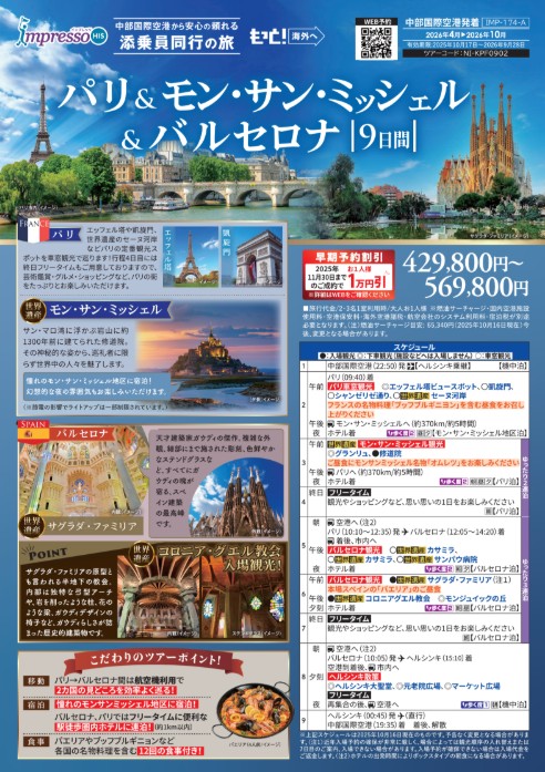 【新聞掲載商品】パリ&モンサンミッシェル&バルセロナ9日間