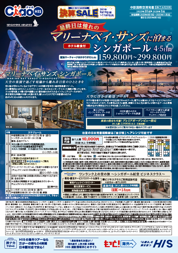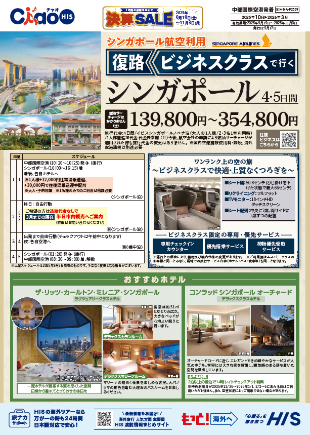 送迎なし・朝食付 シンガポール4日間