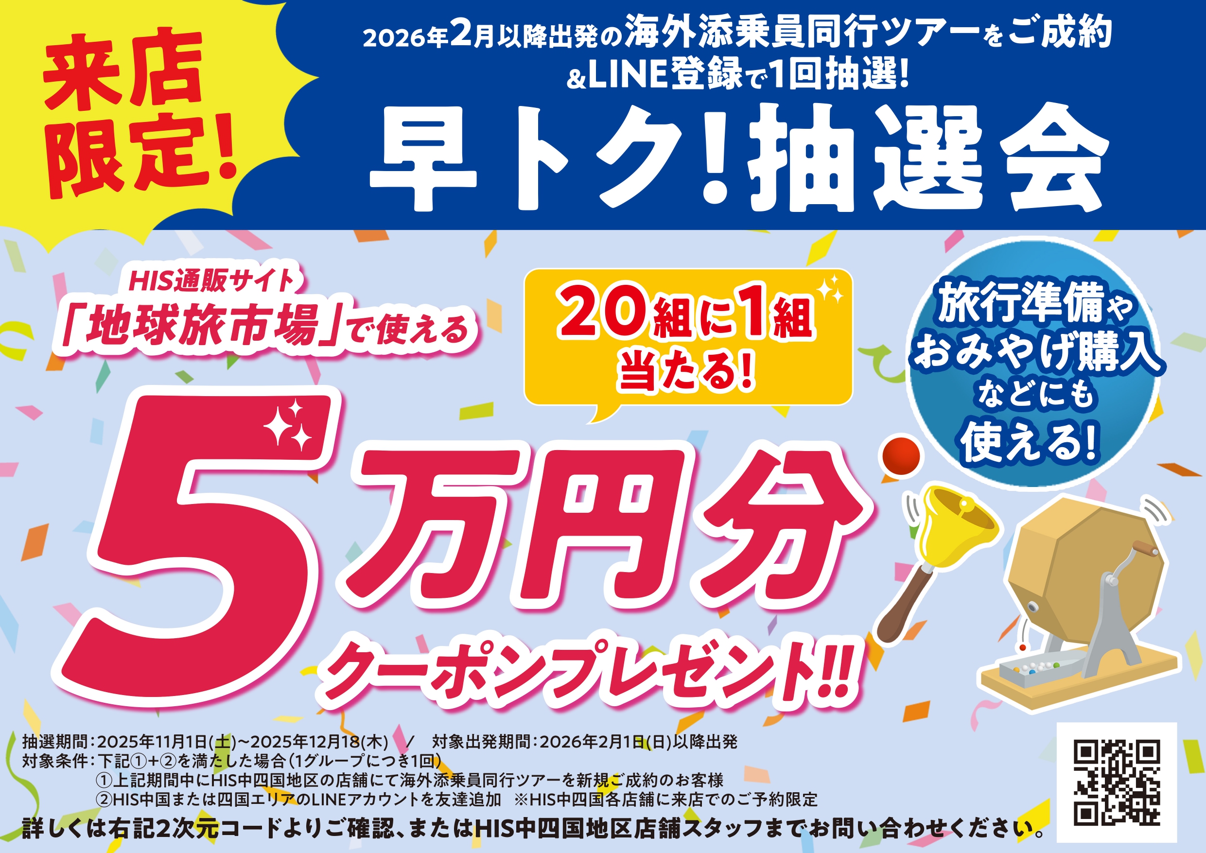 ①期間中に該当商品をHIS中四国の各店舗に来店にてご予約
