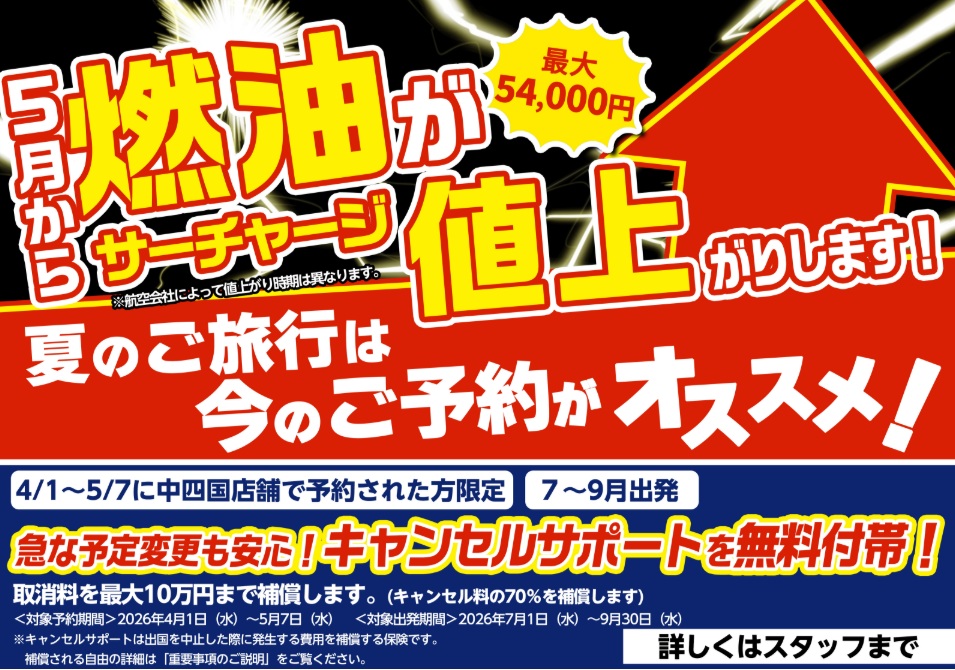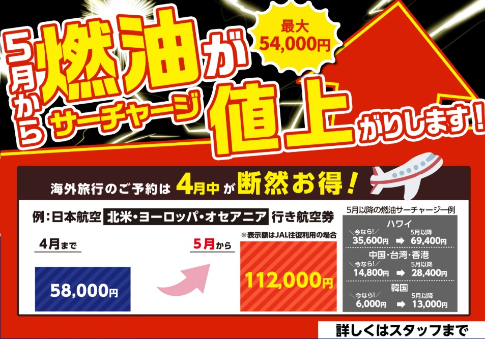 5月より燃油サーチャージ値上がり!「今」ならまだ間に合います!
