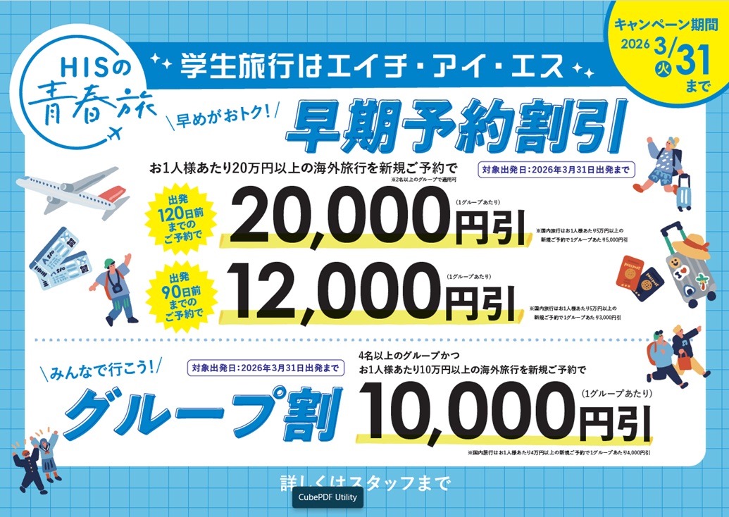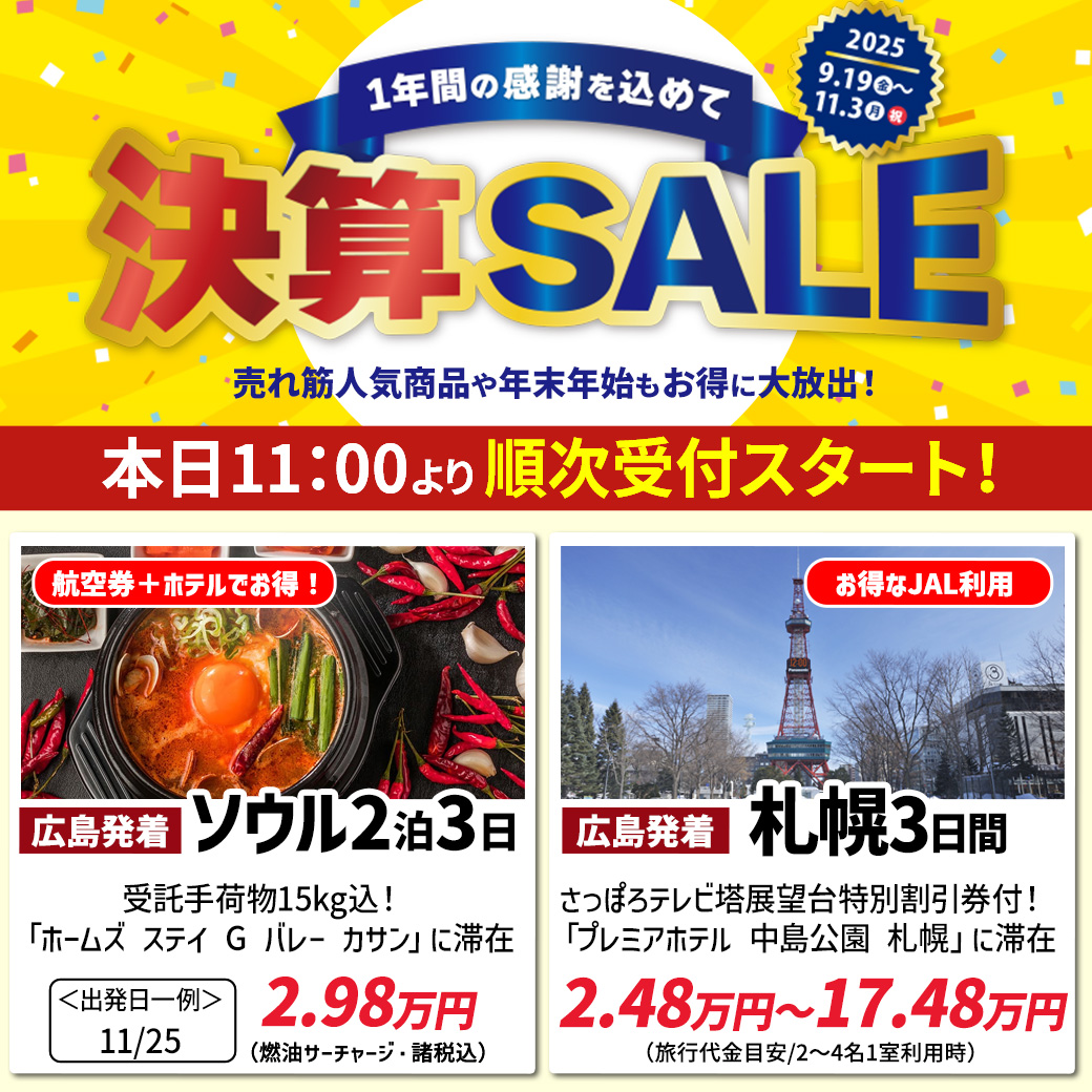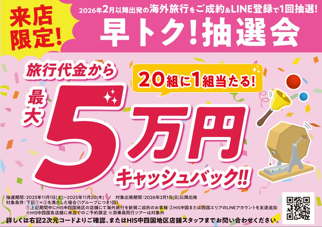 ①期間中に該当商品をHIS中四国の各店舗に来店にてご予約