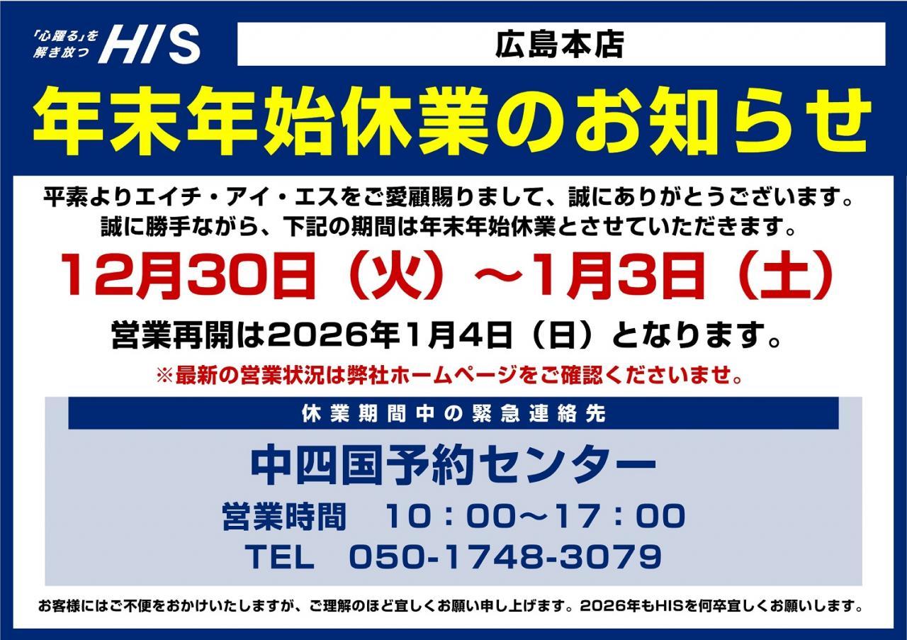 【12/7予約限定です!】HIS国内ツアー 中四国発着限定!最大1万円引き! 2025/12/07