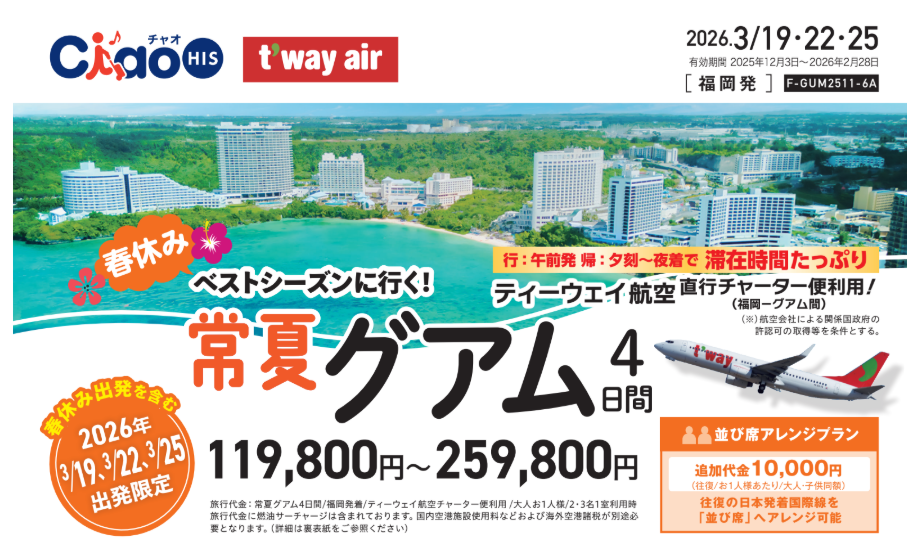 ⚠️ 春休み出発を含むこの日程を逃すと、次の直行チャーター便は未定です!