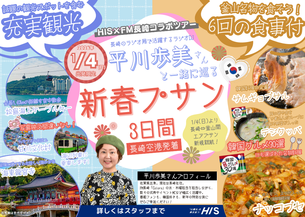 11/21(金)10:00~受付開始【長崎発着】★1/4発2泊3日 FMNagasaki で活躍するラジオDJ 平川歩美さんと一緒に巡るプサン3日間 2025/11/28
