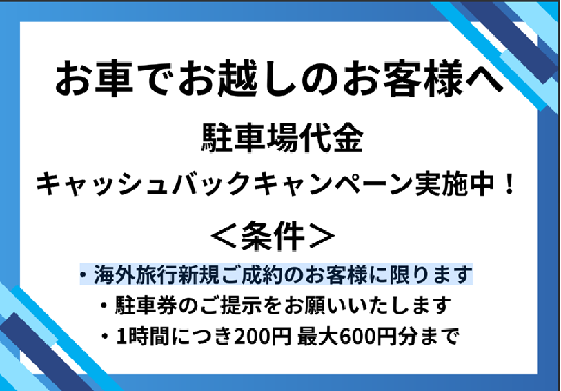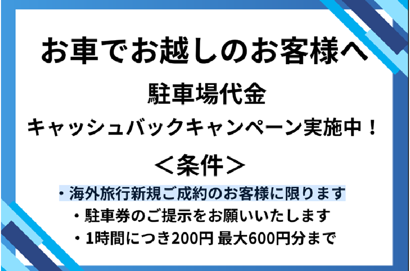 | 駐車場 | なし (【駐車場代金キャッシュバック実施中】海外旅行ご成約のお客様 1時間につき200円 最大600円分迄) | ||