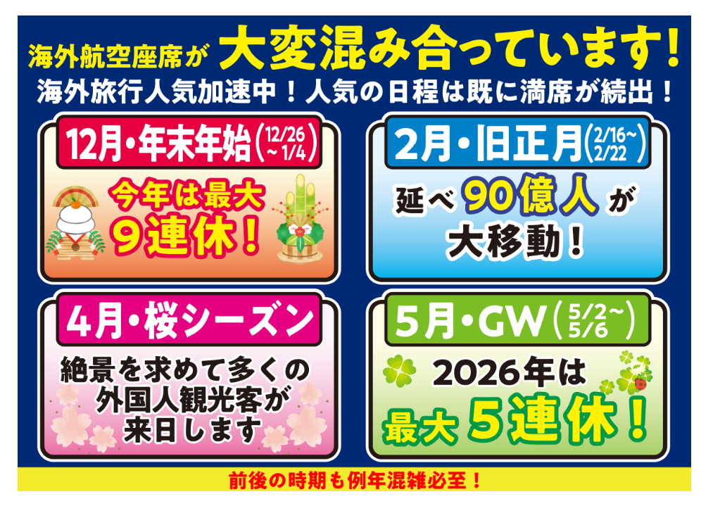 【注意報】海外航空券のお座席は先でも大変混み合っています! 2025/10/22