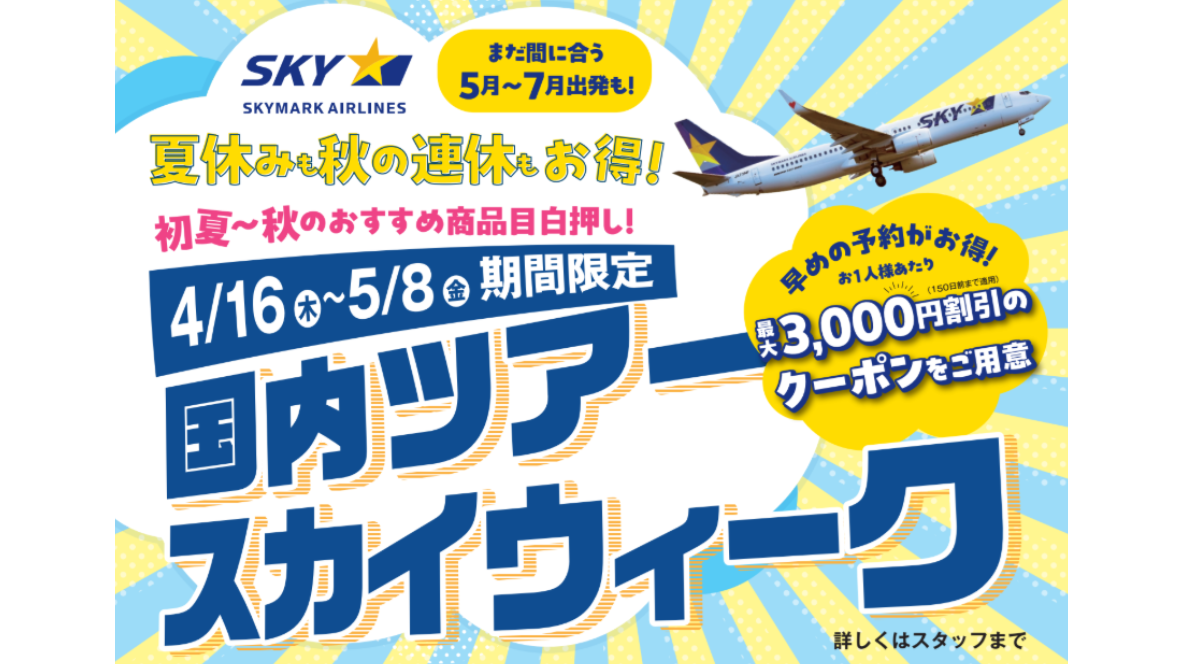 ◇4/16(木)◇ ★スカイマーク利用 お得な国内旅行のご案内★ 2026/04/16